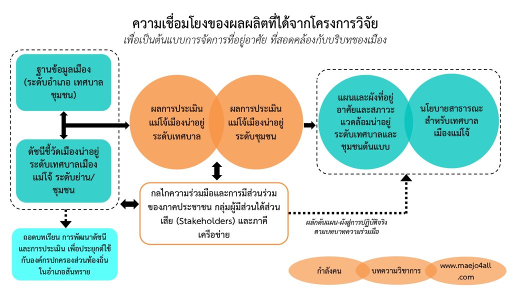 โครงการ “แม่โจ้เมืองน่าอยู่สำหรับทุกคน” มีเป้าหมายเพื่อยกระดับคุณภาพชีวิตประชาชนทุกกลุ่มวัยในเขตเทศบาลเมืองแม่โจ้ ท่ามกลางบริบทการเปลี่ยนแปลงอย่างรวดเร็วของเมือง ทั้งการขยายตัวของชุมชนเมือง (Urbanization) การเข้าสู่สังคมผู้สูงวัย และความท้าทายด้านสิ่งแวดล้อมและโครงสร้างพื้นฐาน โครงการนี้พัฒนาโดยบูรณาการวิทยาศาสตร์ วิจัย และนวัตกรรม ร่วมกับการมีส่วนร่วมของชุมชนและหน่วยงานทุกระดับ เพื่อจัดทำแผนและผังการจัดการที่อยู่อาศัยสำหรับทุกคน โดยเน้นการสร้างเมืองที่อยู่ได้จริง น่าอยู่อาศัย น่าลงทุน และยั่งยืนในระยะยาว ทั้งในมิติที่อยู่อาศัย เศรษฐกิจ สิ่งแวดล้อม และการเข้าถึงบริการสาธารณะ
